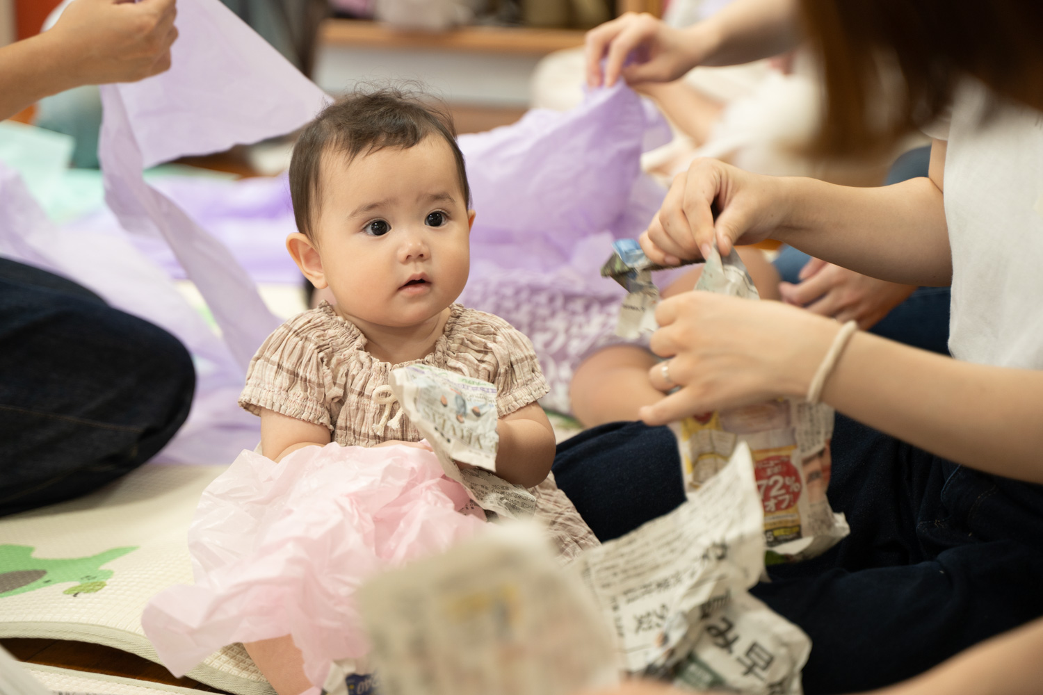 お話のあいだにも、すでにあかちゃんたちは目の前に置かれた紙に興味津々。ちいさな手をうんと伸ばし、くしゃくしゃとにぎって感触をたしかめていました。