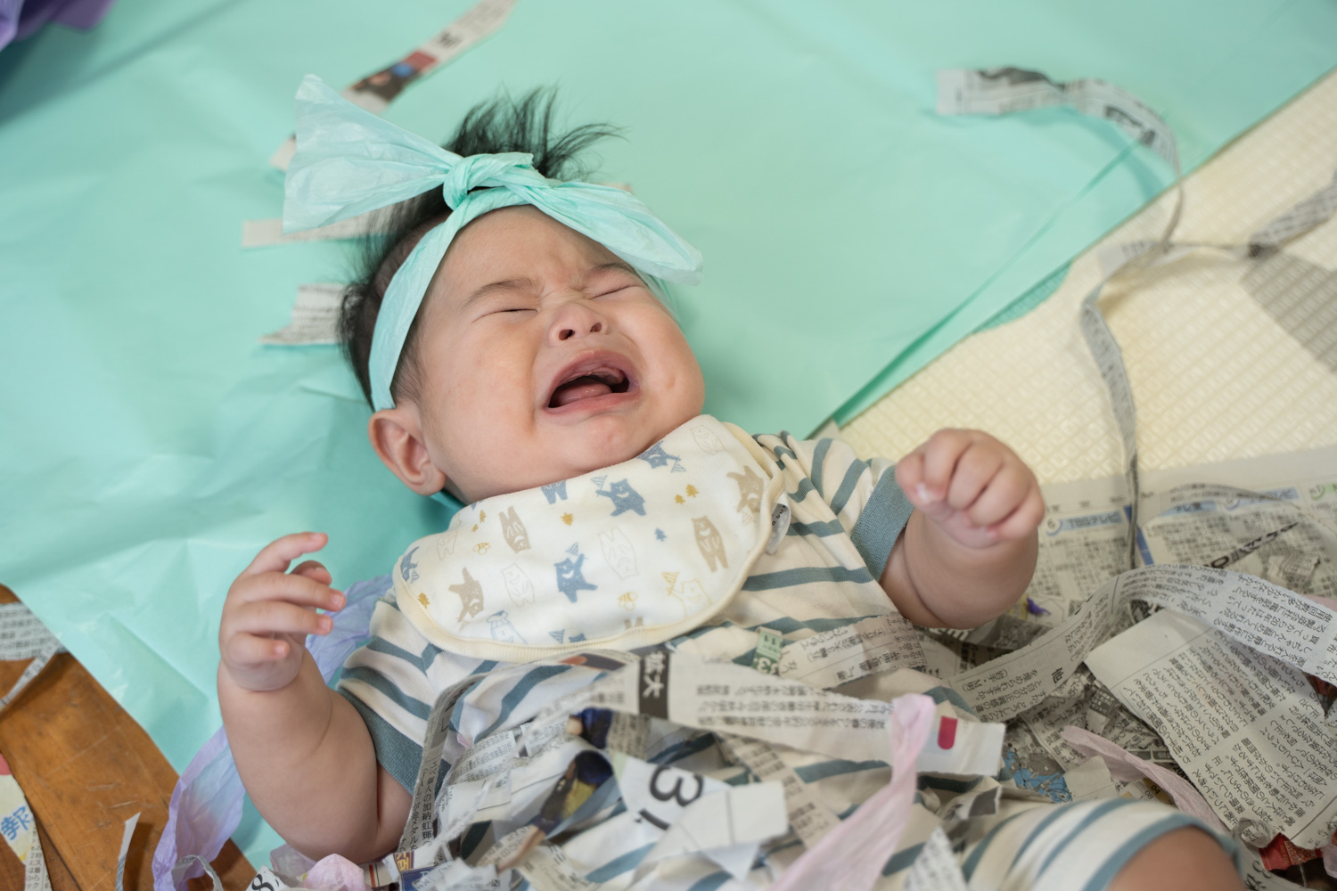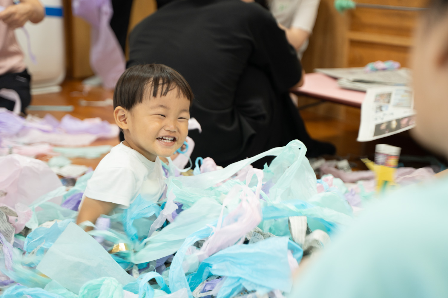色とりどりの紙にうもれて大興奮のあかちゃんもいれば、「はやくかたづけないと!」と言わんばかりに自分のまわりにある紙を一生懸命押しのけているあかちゃんもいて、個々の性格やこだわりが垣間見えるシーンもありました。