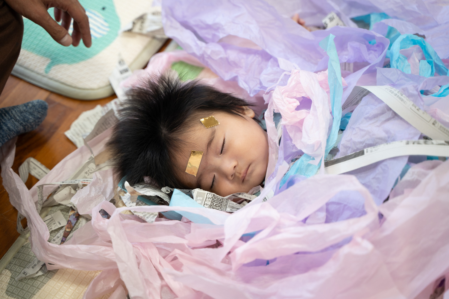 ふわふわの紙のおふとんに包まれて、にこにこご機嫌だったあかちゃんは、いつの間にかそのまま夢の世界へ。きもちよさそうな寝顔に、見ているまわりのおとなたちも幸せな気持ちになりました。