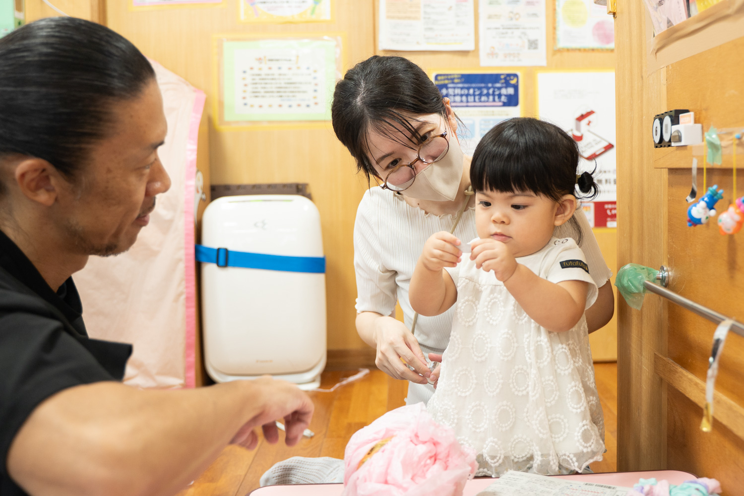 マスキングテープで壁に貼った紙かざりを引っ張ってはずし、「はずしちゃうの〜?」と困った顔をするおとなたちの反応をみて、いたずらっぽい笑顔をみせるあかちゃんも。