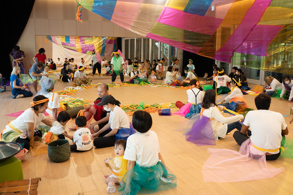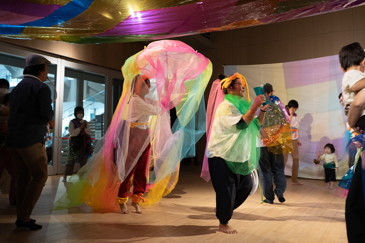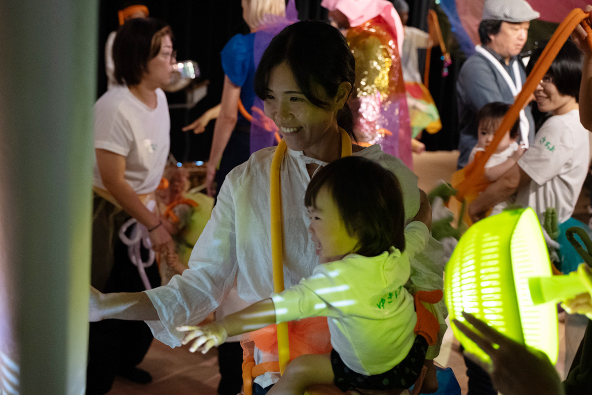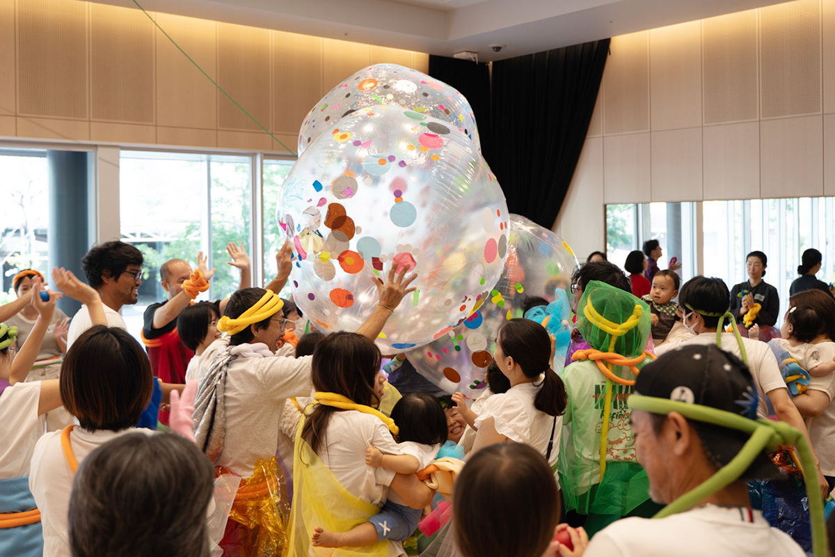 布クラゲを追いかける子、音楽隊の楽器を一緒になって演奏する子、抱っこのまま保護者と一緒にクルクル回る子。少し離れたところから見ると、まるで深海でカラフルないきものたちがうごめいているかのようです。