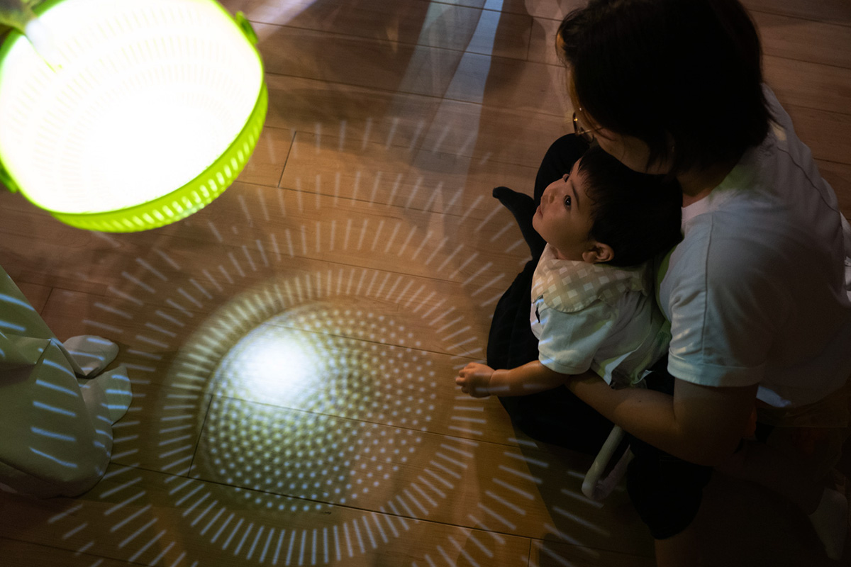 懐中電灯のホタルや、ザルが映し出すふしぎなもよう。あかちゃんと保護者の楽しげな笑い声が響きます。