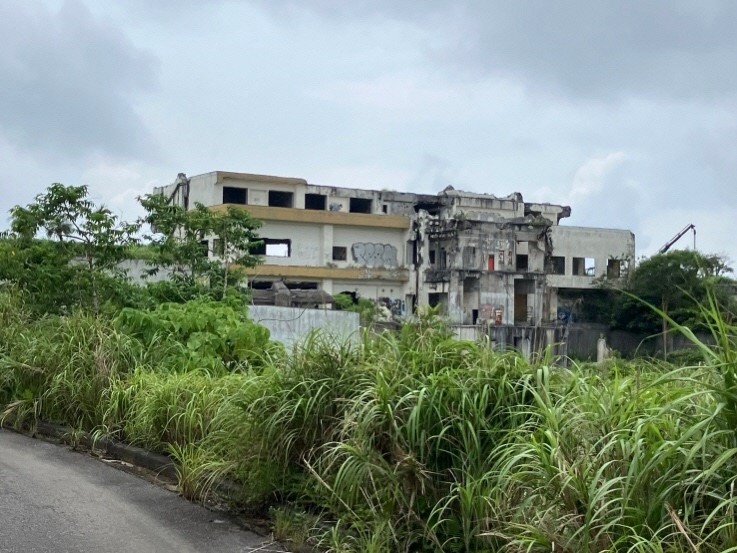 こちらは大宜味村田港にあったホテルで、いまは廃業し、解体も途中で停止しており、廃墟となっています。1986年に「リゾーピア・ホテル友善」として開業し、途中で「サンセットビュー・イン・シャーベイ」に改称。
