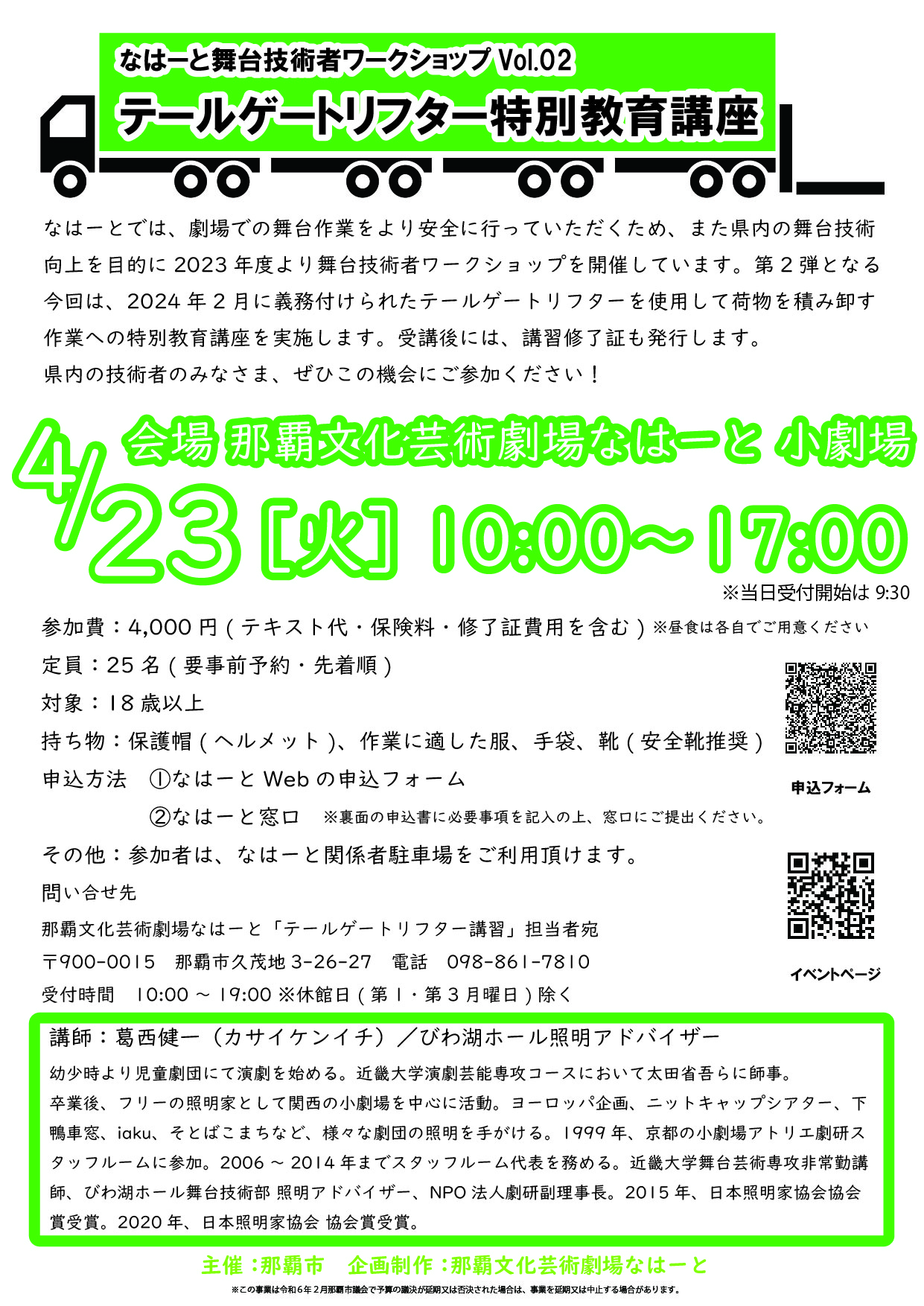 なはーとでは、劇場での舞台作業をより安全に行っていただくため、また県内の舞台技術向上を目的に、舞台技術ワークショップを開催していきます。 県内の技術員のみなさま、ぜひこの機会にご参加ください!
